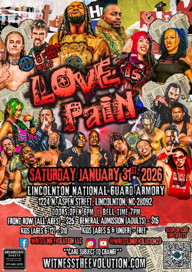Wrestling Evolution returns to action on January 31st at the National Guard Armory at 1224 N. Aspen Street in Lincolnton, NC. While the match ups have not been announced yet, we do know that the following superstars will be in attendance: